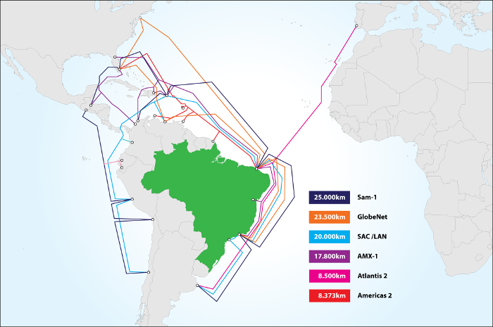 Existem 6 cabos no Brasil sendo 3 de empresas privadas, os outros 3 são o Atlantis 2, Americas 2 e Sam-1.